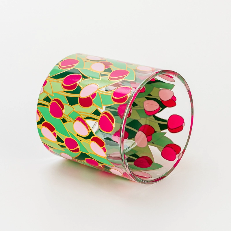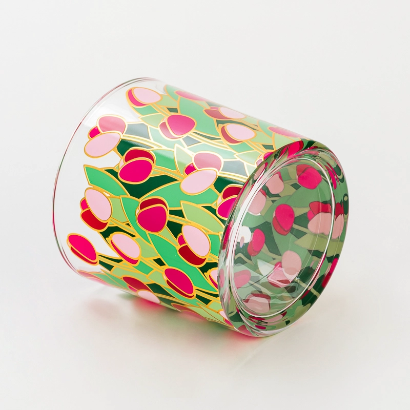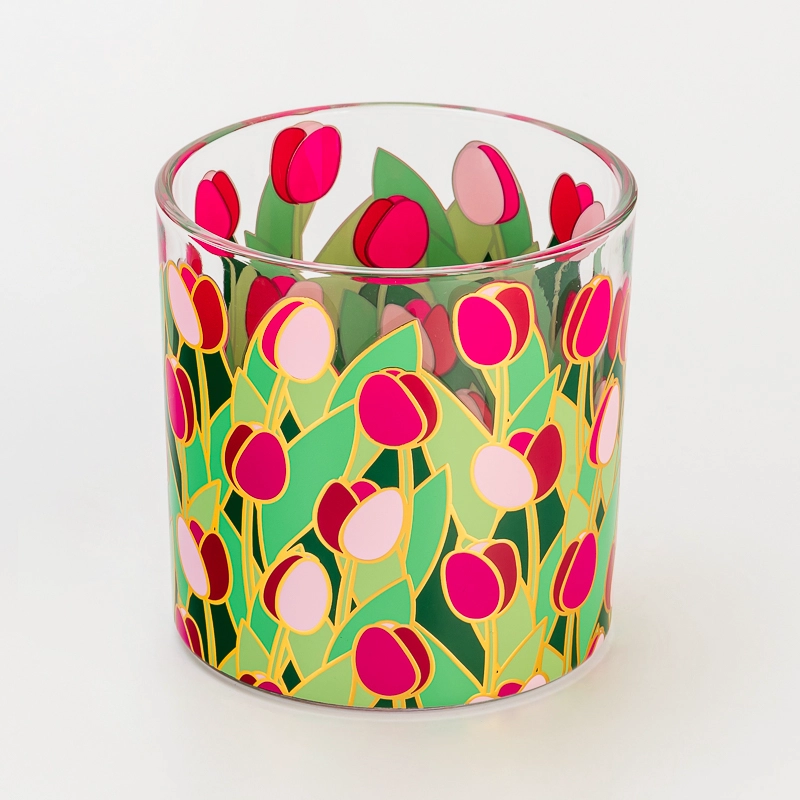 실린더 유리 캔들 항아리 - 꽃 데칼 인쇄 주위 전체